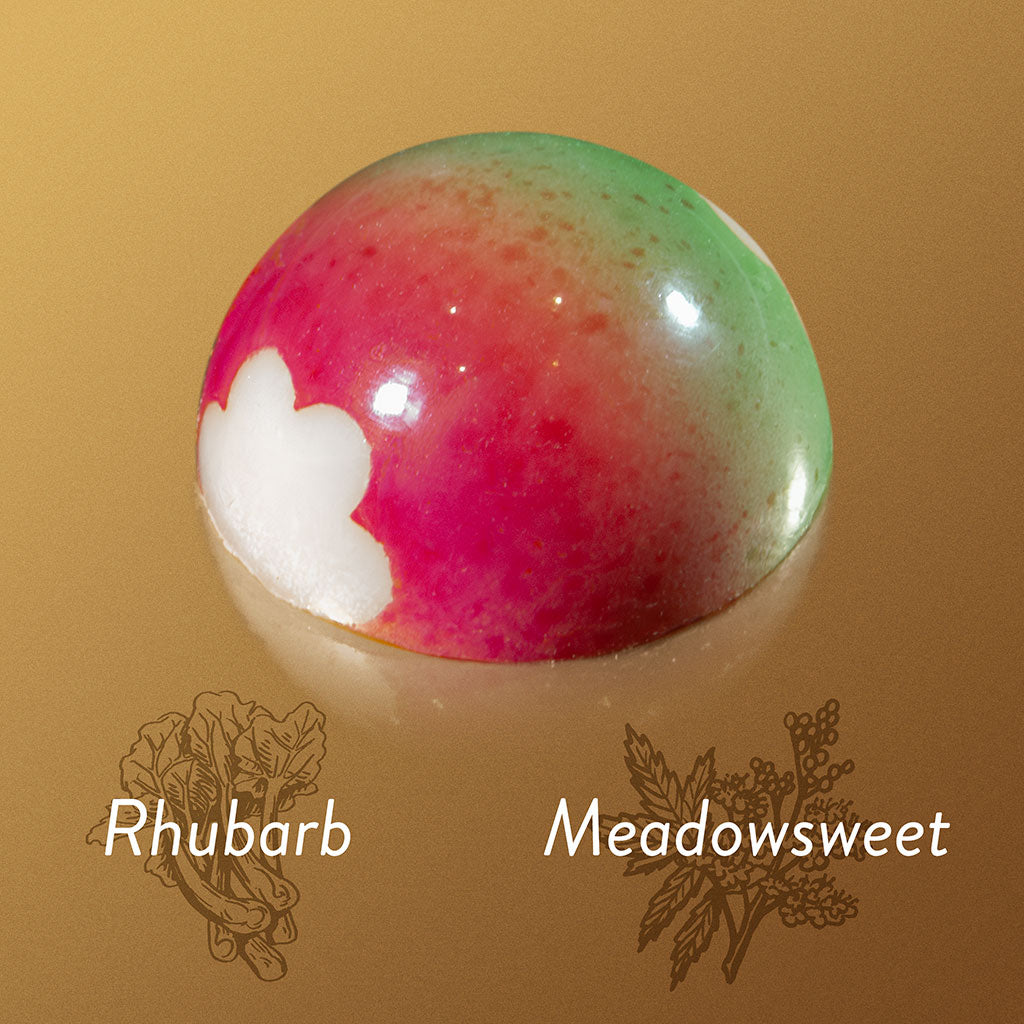 Rhubarb pâte de fruit tops a layer of white chocolate ganache, flavoured with foraged meadowsweet. All in a dairy-free white chocolate shell.