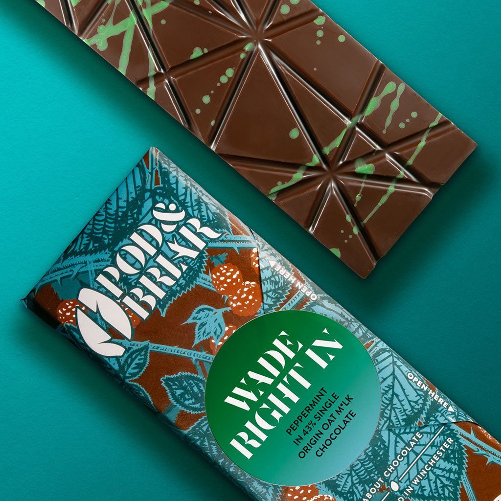 Chocolate (sugar, cocoa butter, dried gluten-free oat powder, cocoa mass, dried rice powder, emulsifier: sunflower lecithin, vanilla extract), Peppermint Oil, Decoration: Candied Mint Leaves (sugar, coating agent: gum arabic, mint leaves, colouring: E141), Cocoa butter, Concentrates of safflower and spirulina.