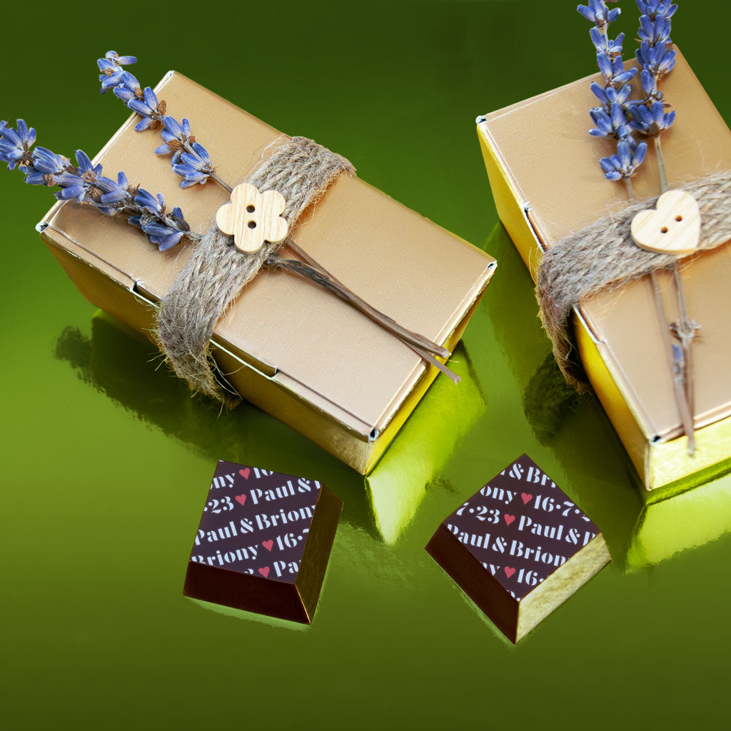 These clean, crisp chocolate squares are topped with a personalised design showing the bride and groom's name and the date they’re getting hitched.
