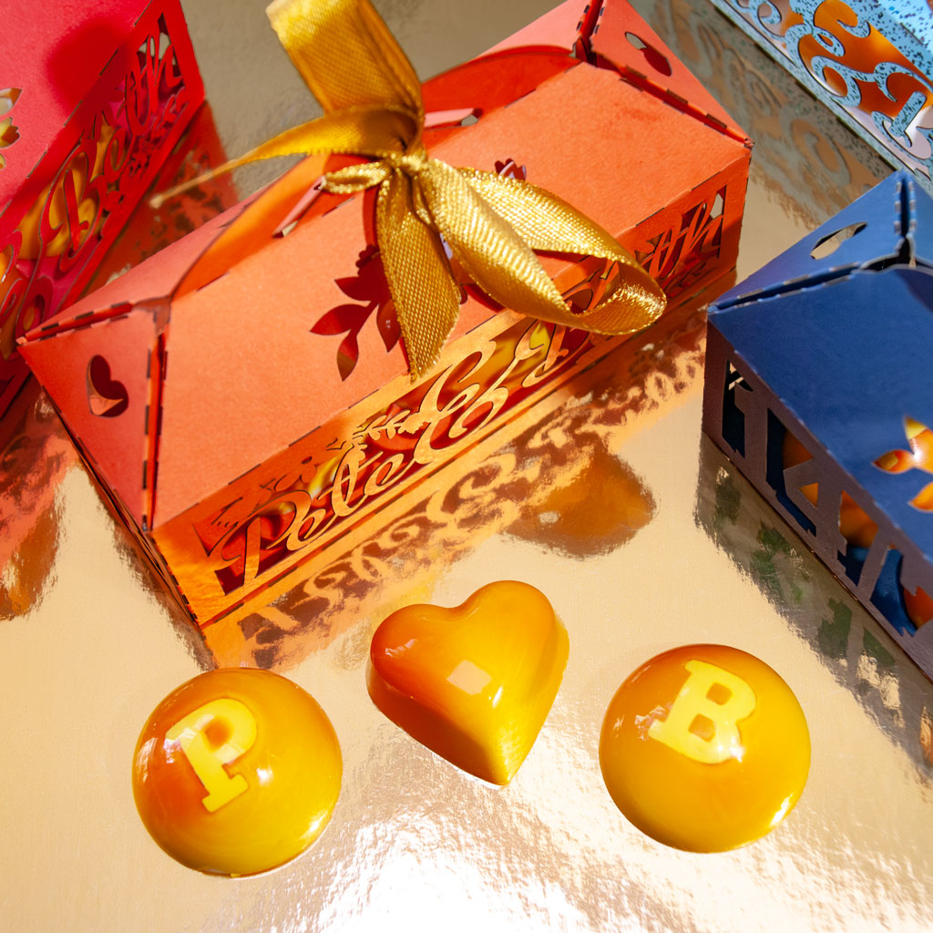 In this example, each guest receives three hand-made chocolates in bespoke, laser-cut coloured boxes.