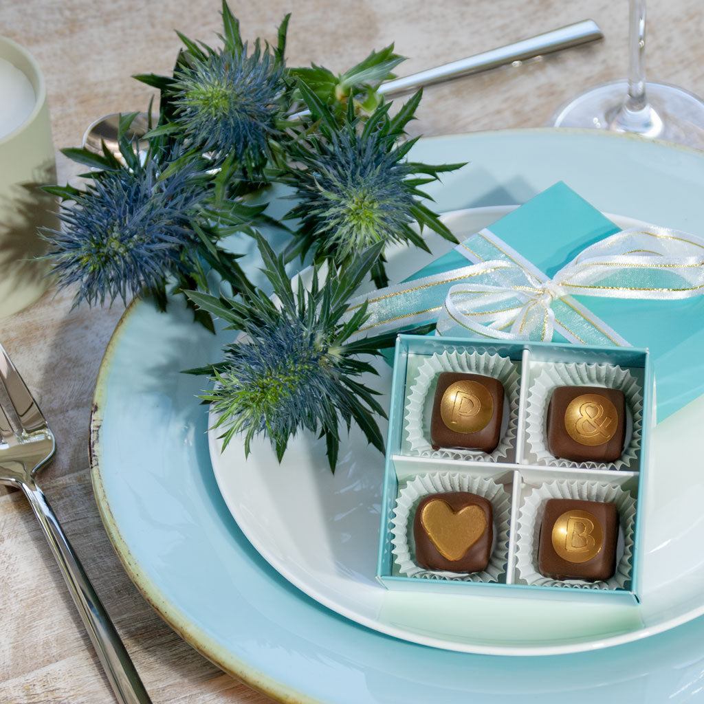 - Each set of four chocolates is presented to your guests in a plastic-free box, in your theme colour and sealed with matching ribbon.
