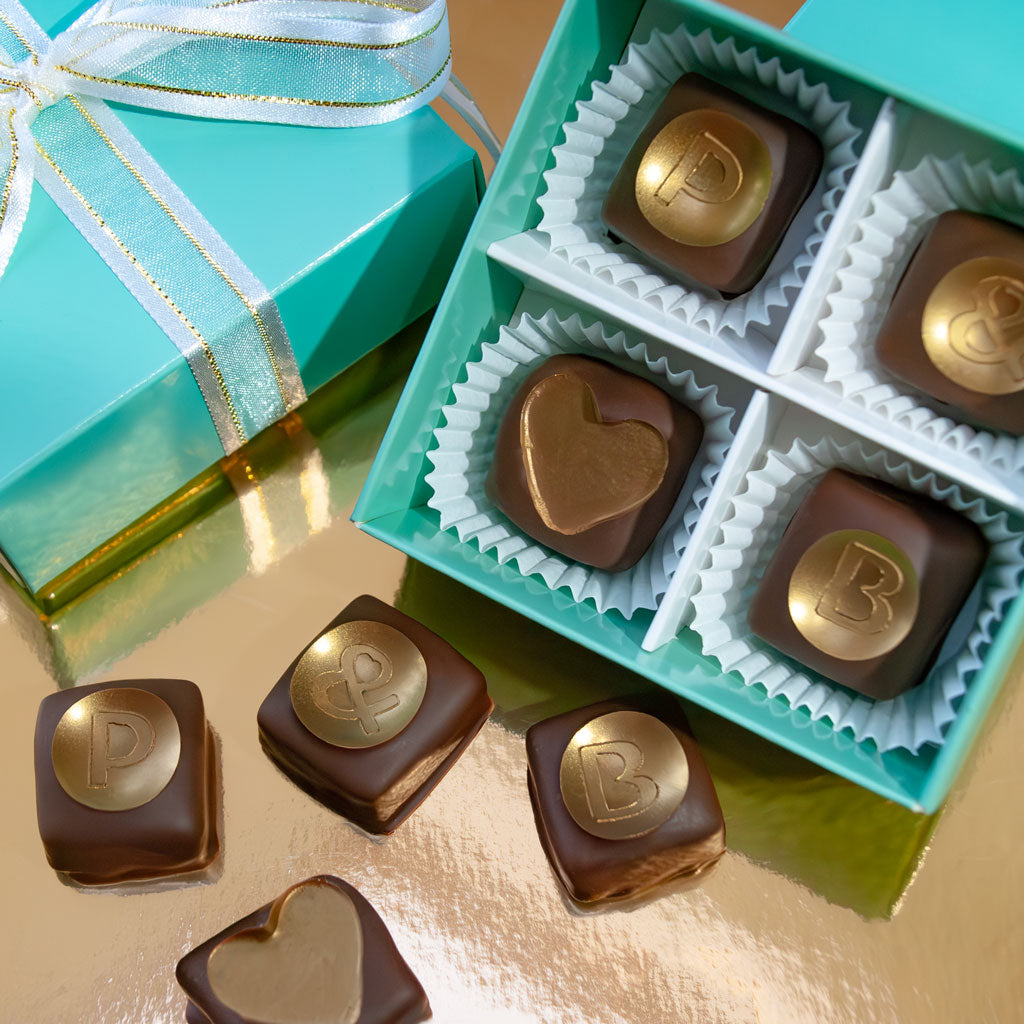 These elegant, dipped chocolate squares are topped with the bride and groom’s monograms, plus ampersand (&) and heart motifs to create a gold hallmark-style design.